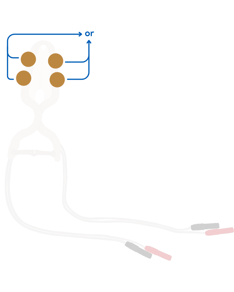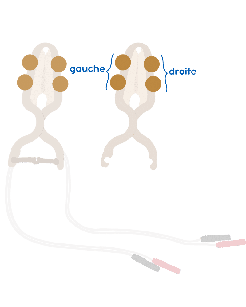 Les 2 fiches de droites sont liées aux 2 électrodes de droites, et les 2 fiches de gauches sont liées aux 2 électrodes de gauches. Le câble le plus long est relié à l’électrode la plus proche de la base, et le câble le plus court est lié à l’électrode la plus loin de la base. Il faudra ensuite utiliser les électrodes en fonction du côté à rééduquer.
