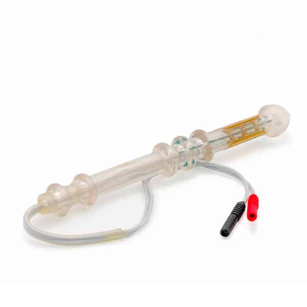 – 1 sonde ANALYS+ ® : une sonde à deux électrodes-barrettes latérales. Ses trois encoches facilitent le positionnement et le maintien au niveau du sphincter anal externe, tandis que sa longueur évite l’aspiration rectale, assurant un travail de contre-résistance. La sonde ANALYS+ existe en connexion BANANE.